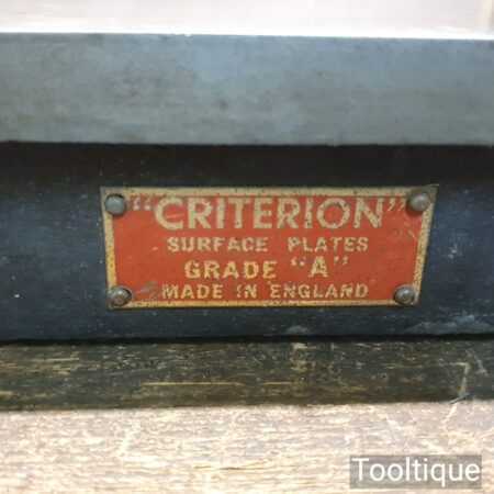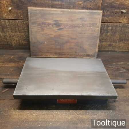 Vintage Criterion grade-A 12” x 8” cast steel surface plate with pine protective cover, in good used condition.