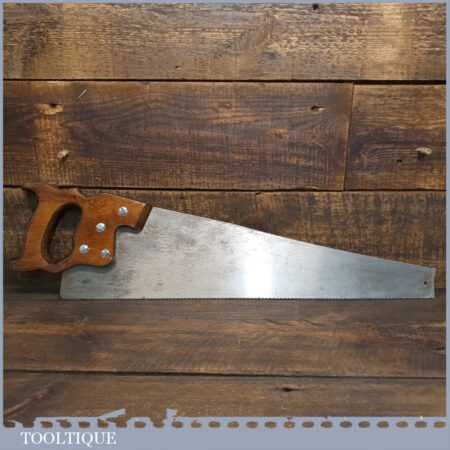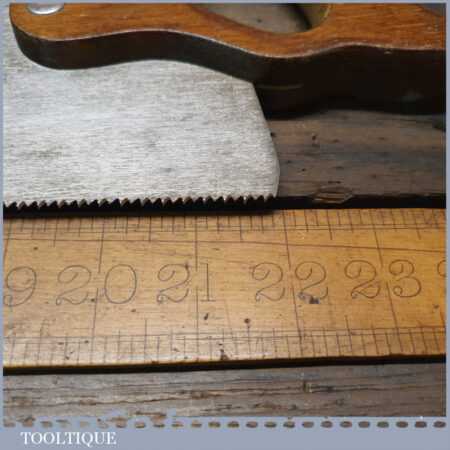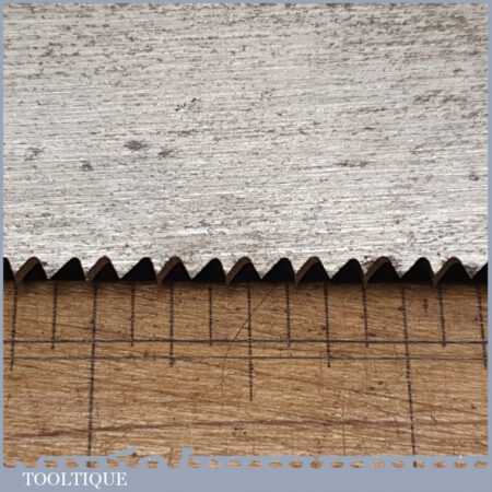 The saw has been thoroughly cleaned, jointed, resharpened and set by hand so that all the hard work of getting an old vintage saw right has been undertaken. We do this so that the next sharpening is easier and no more than a quick freshen up would be required. Those who are familiar with sharpening will know this is no small job and requires skill, effort and time to achieve good results.