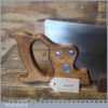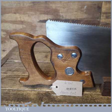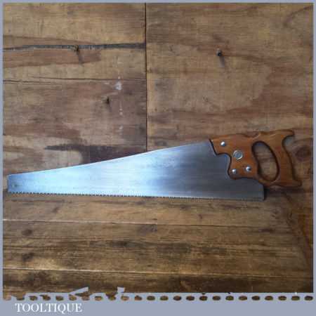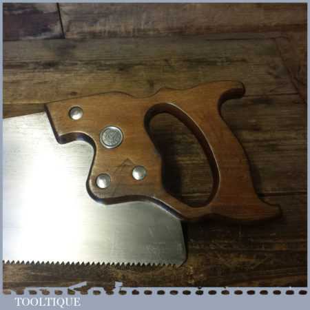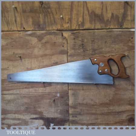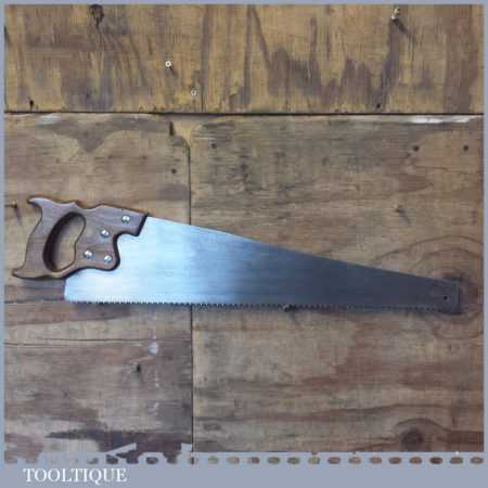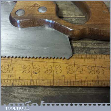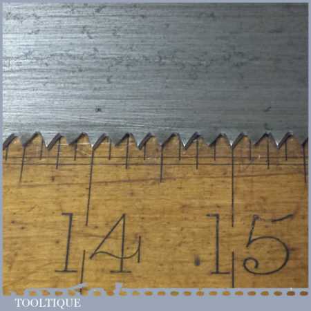 The saw has been thoroughly cleaned, jointed, resharpened and set by hand so that all the hard work of getting an old vintage saw right has been undertaken. We do this so that the next sharpening is easier and no more than a quick freshen up would be required. Those who are familiar with sharpening will know this is no small job and requires skill, effort and time to achieve good results.