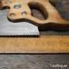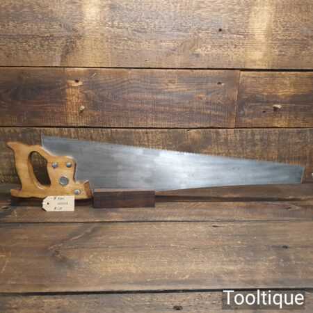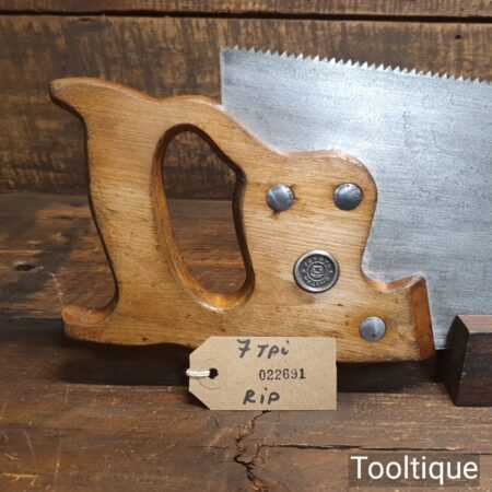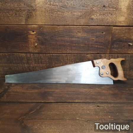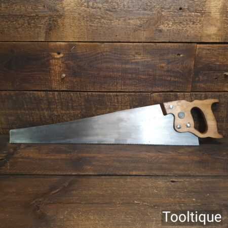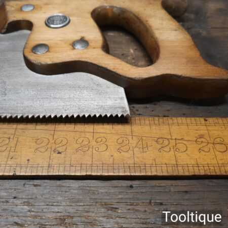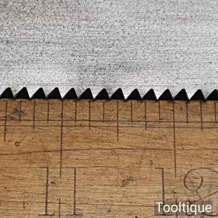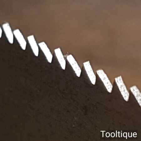 The saw has been thoroughly cleaned, jointed, resharpened and set by hand so that all the hard work of getting an old vintage saw right has been undertaken. We do this so that the next sharpening is easier and no more than a quick freshen up would be required. Those who are familiar with sharpening will know this is no small job and requires skill, effort and time to achieve good results.