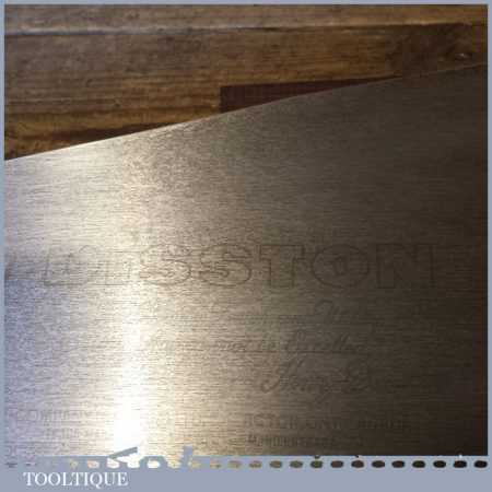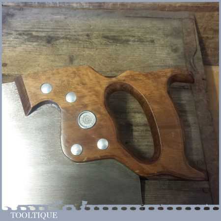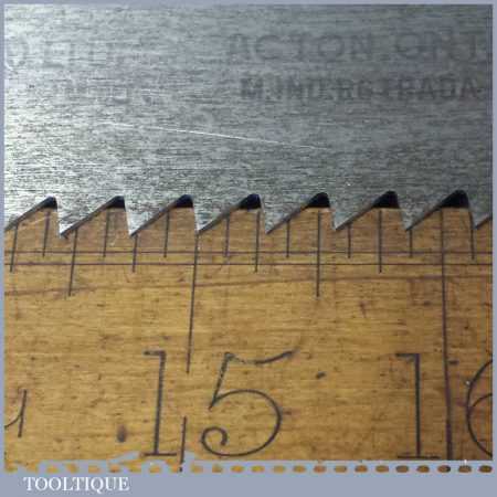 The saw has been thoroughly cleaned, jointed, resharpened and set by hand so that all the hard work of getting an old vintage saw right has been undertaken. We do this so that the next sharpening is easier and no more than a quick freshen up would be required. Those who are familiar with sharpening will know this is no small job and requires skill, effort and time to achieve good results.