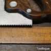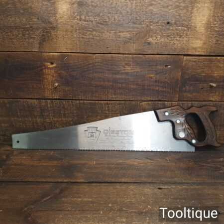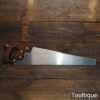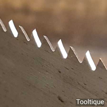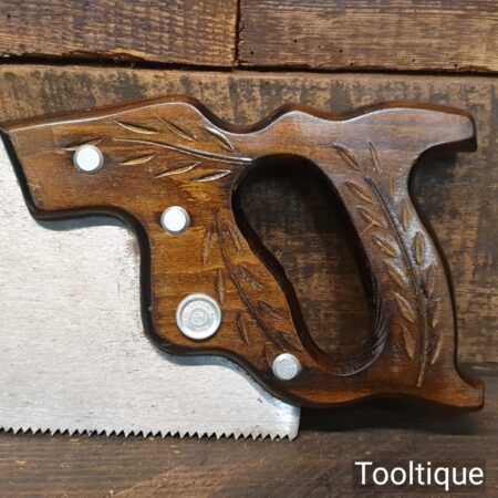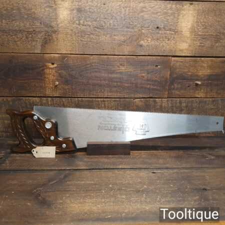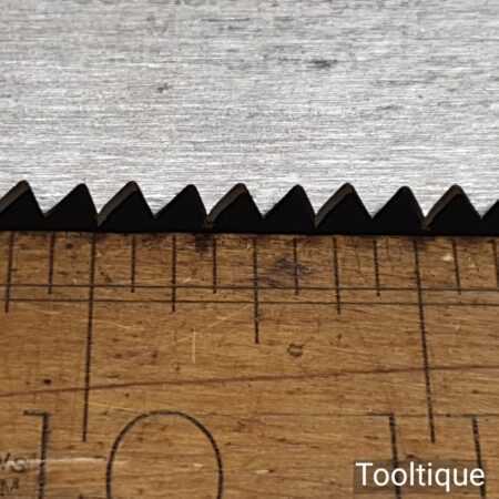 The saw has been thoroughly cleaned, jointed, resharpened and set by hand so that all the hard work of getting an old vintage saw right has been undertaken. We do this so that the next sharpening is easier and no more than a quick freshen up would be required. Those who are familiar with sharpening will know this is no small job and requires skill, effort and time to achieve good results