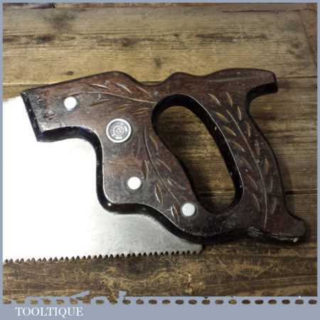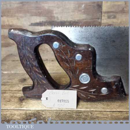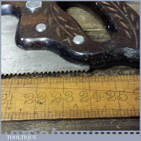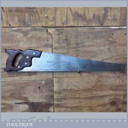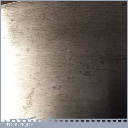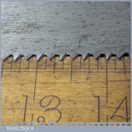 The saw has been thoroughly cleaned, jointed, resharpened and set by hand so that all the hard work of getting an old vintage saw right has been undertaken. We do this so that the next sharpening is easier and no more than a quick freshen up would be required. Those who are familiar with sharpening will know this is no small job and requires skill, effort and time to achieve good results.