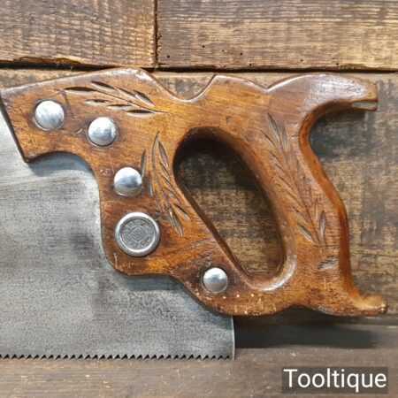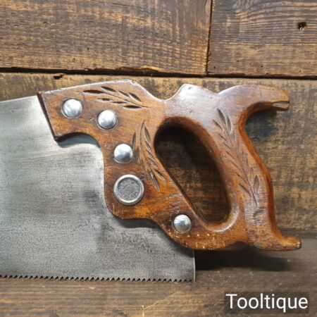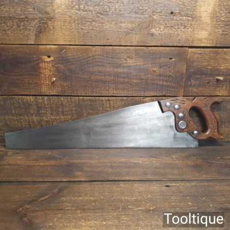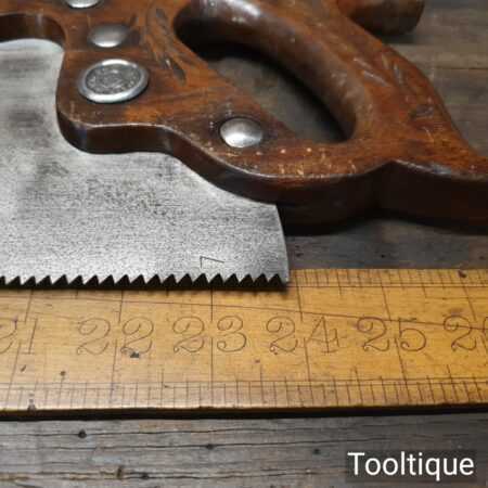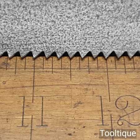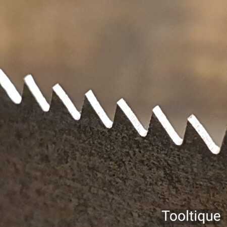 The saw has been thoroughly cleaned, jointed, resharpened and set by hand so that all the hard work of getting an old vintage saw right has been undertaken. We do this so that the next sharpening is easier and no more than a quick freshen up would be required. Those who are familiar with sharpening will know this is no small job and requires skill, effort and time to achieve good results.