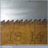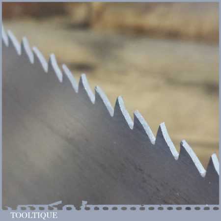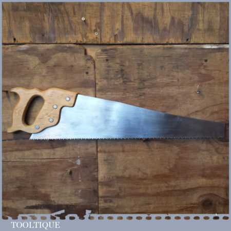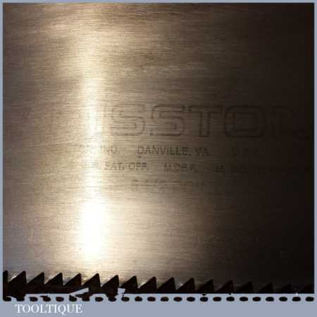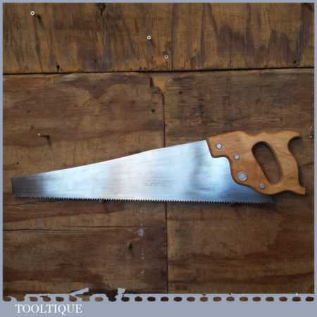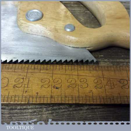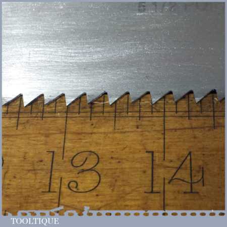 The saw has been thoroughly cleaned, jointed, resharpened and set by hand so that all the hard work of getting an old vintage saw right has been undertaken. We do this so that the next sharpening is easier and no more than a quick freshen up would be required. Those who are familiar with sharpening will know this is no small job and requires skill, effort and time to achieve good results.