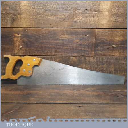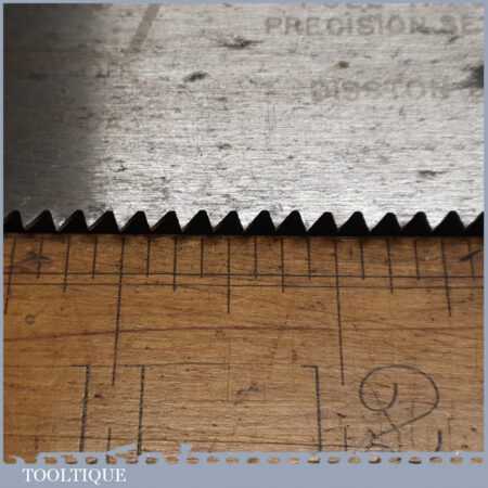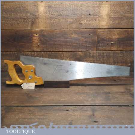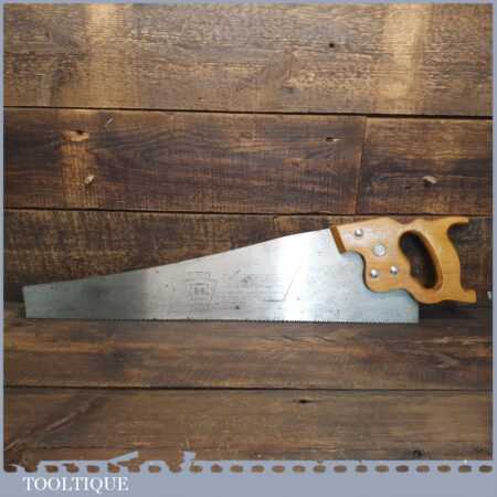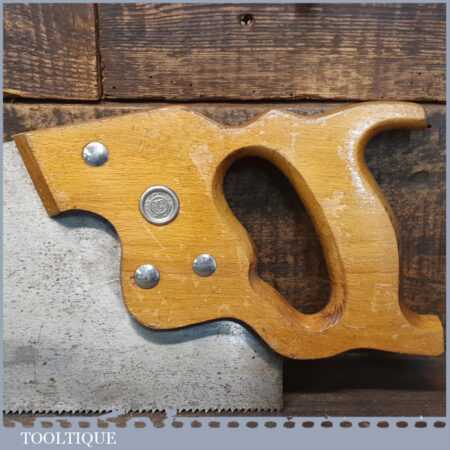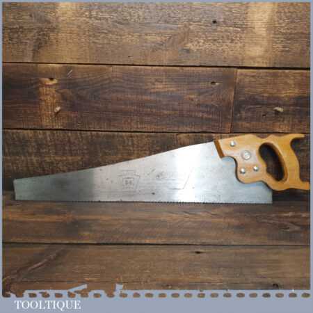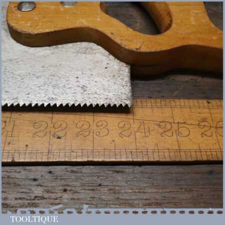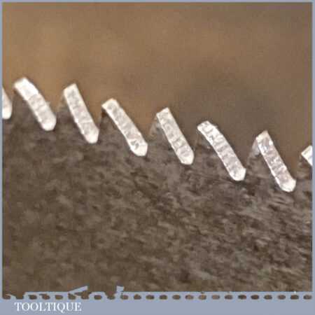 The saw has been thoroughly cleaned, jointed, resharpened and set by hand so that all the hard work of getting an old vintage saw right has been undertaken. We do this so that the next sharpening is easier and no more than a quick freshen up would be required. Those who are familiar with sharpening will know this is no small job and requires skill, effort and time to achieve good results.