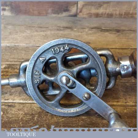 Vintage double pinion egg beater hand drill. The drill is marked ‘SIF’ and has the war Dept broad arrow stamp dated 1944 and is in a good used condition.