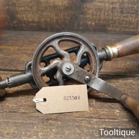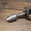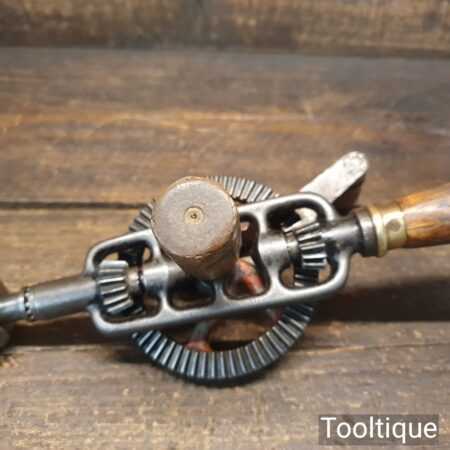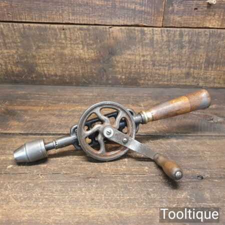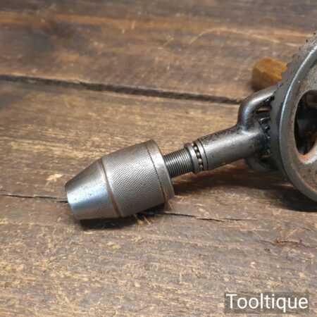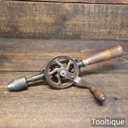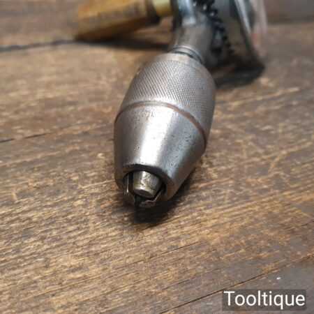Vintage double pinion egg beater hand drill with quick release chuck and beechwood handles in good usable condition. Marked foreign probably German and has larger chuck than most this size