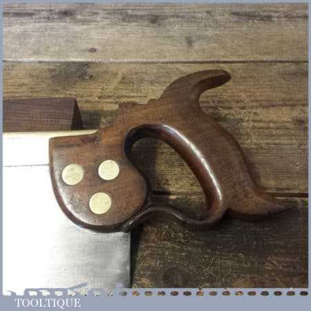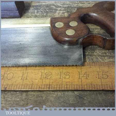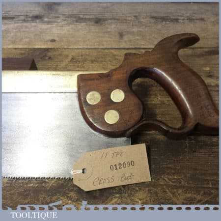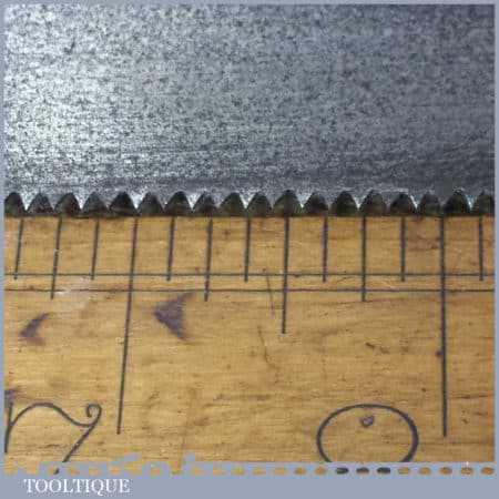 The saw has been thoroughly cleaned, jointed, resharpened and set by hand so that all the hard work of getting an old vintage saw right has been undertaken. We do this so that the next sharpening is easier and no more than a quick freshen up would be required. Those who are familiar with sharpening will know this is no small job and requires skill, effort and time to achieve good results.