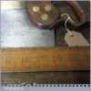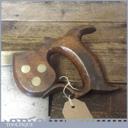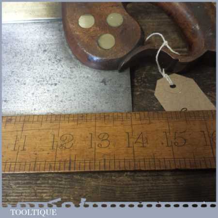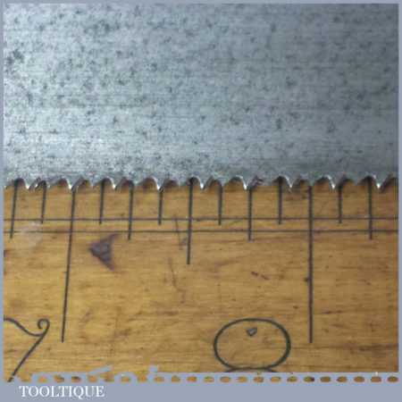 The saw has been thoroughly cleaned including under the handle, jointed, resharpened and set by hand so that all the hard work of getting an old vintage saw right has been undertaken. We do this so that the next sharpening is easier and no more than a quick freshen up would be required. Those who are familiar with sharpening will know this is no small job and requires skill, effort and time to achieve good results.