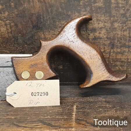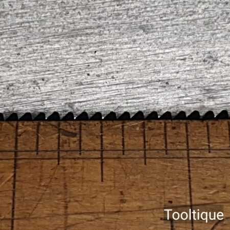 The saw has been thoroughly cleaned, jointed, resharpened and set by hand so that all the hard work of getting an old vintage saw right has been undertaken. We do this so that the next sharpening is easier and no more than a quick freshen up would be required. Those who are familiar with sharpening will know this is no small job and requires skill, effort and time to achieve good results.
