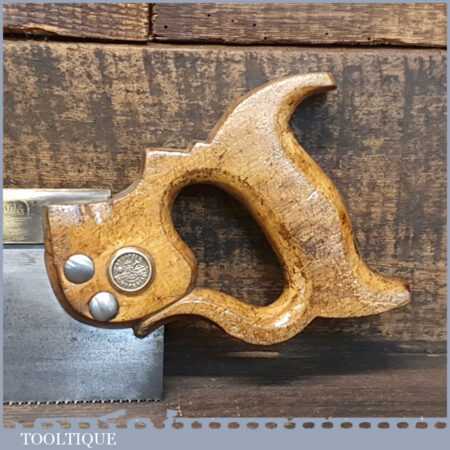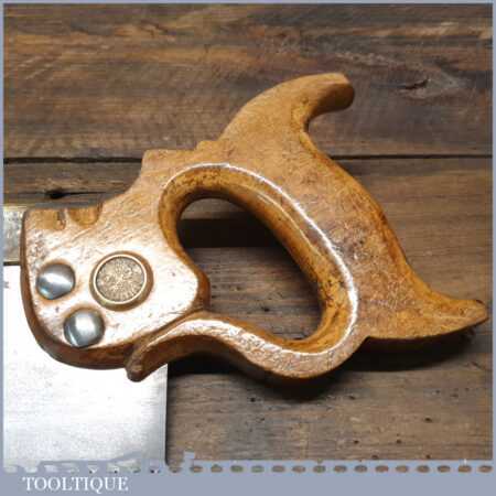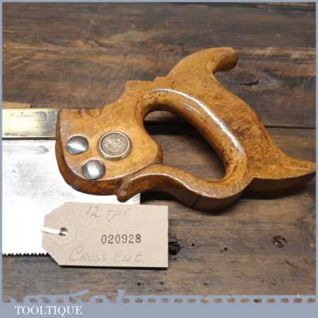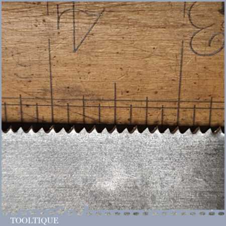 The saw has been thoroughly cleaned, jointed, resharpened and set by hand so that all the hard work of getting an old vintage saw right has been undertaken. We do this so that the next sharpening is easier and no more than a quick freshen up would be required. Those who are familiar with sharpening will know this is no small job and requires skill, effort and time to achieve good results.