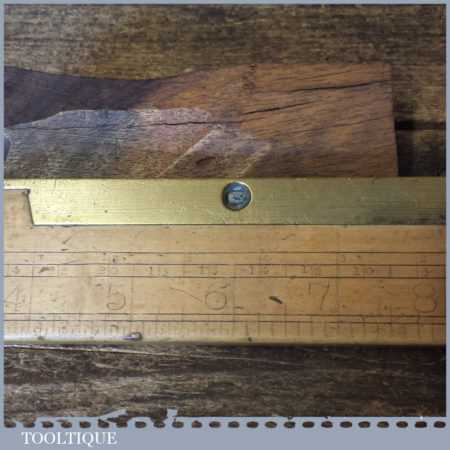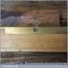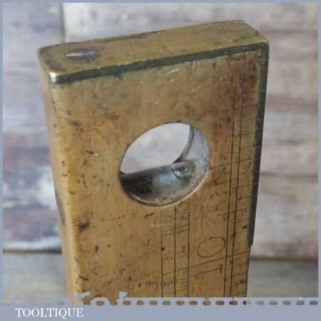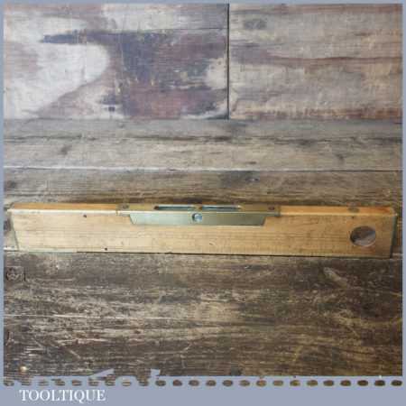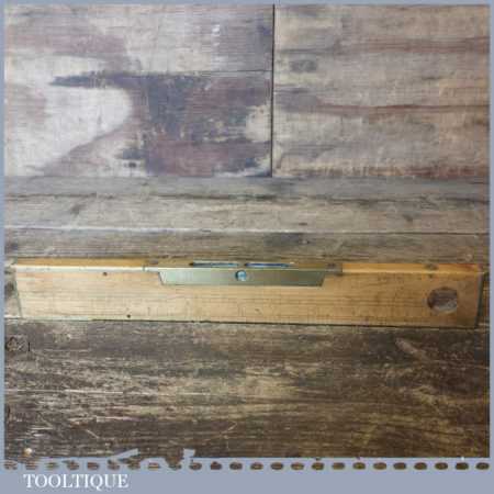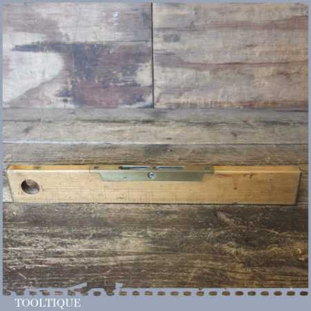 Vintage E. Preston & Sons boxwood and brass 12” calibrated spirit level with original clear bubble tubes in fair used condition. Note: the level hasn’t been tested and may require resetting in putty if intended for use.