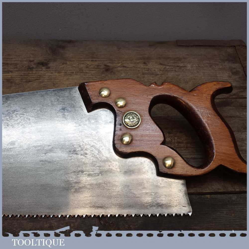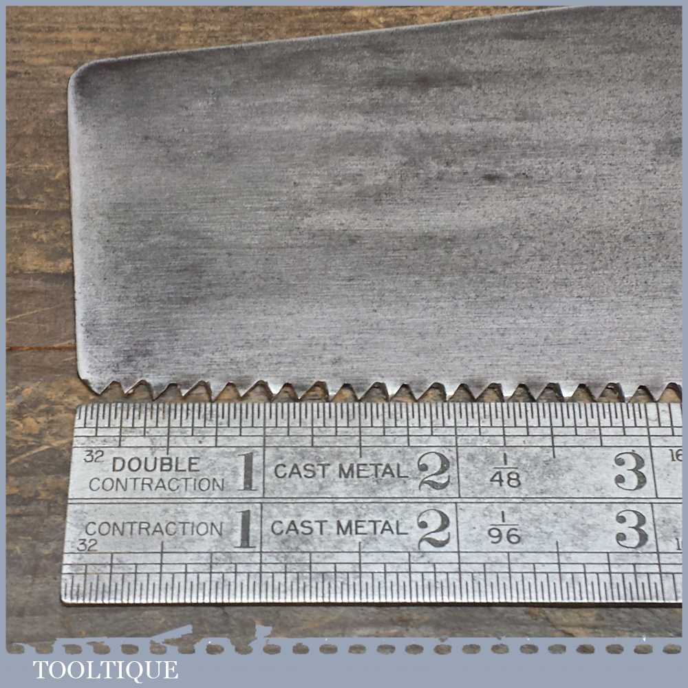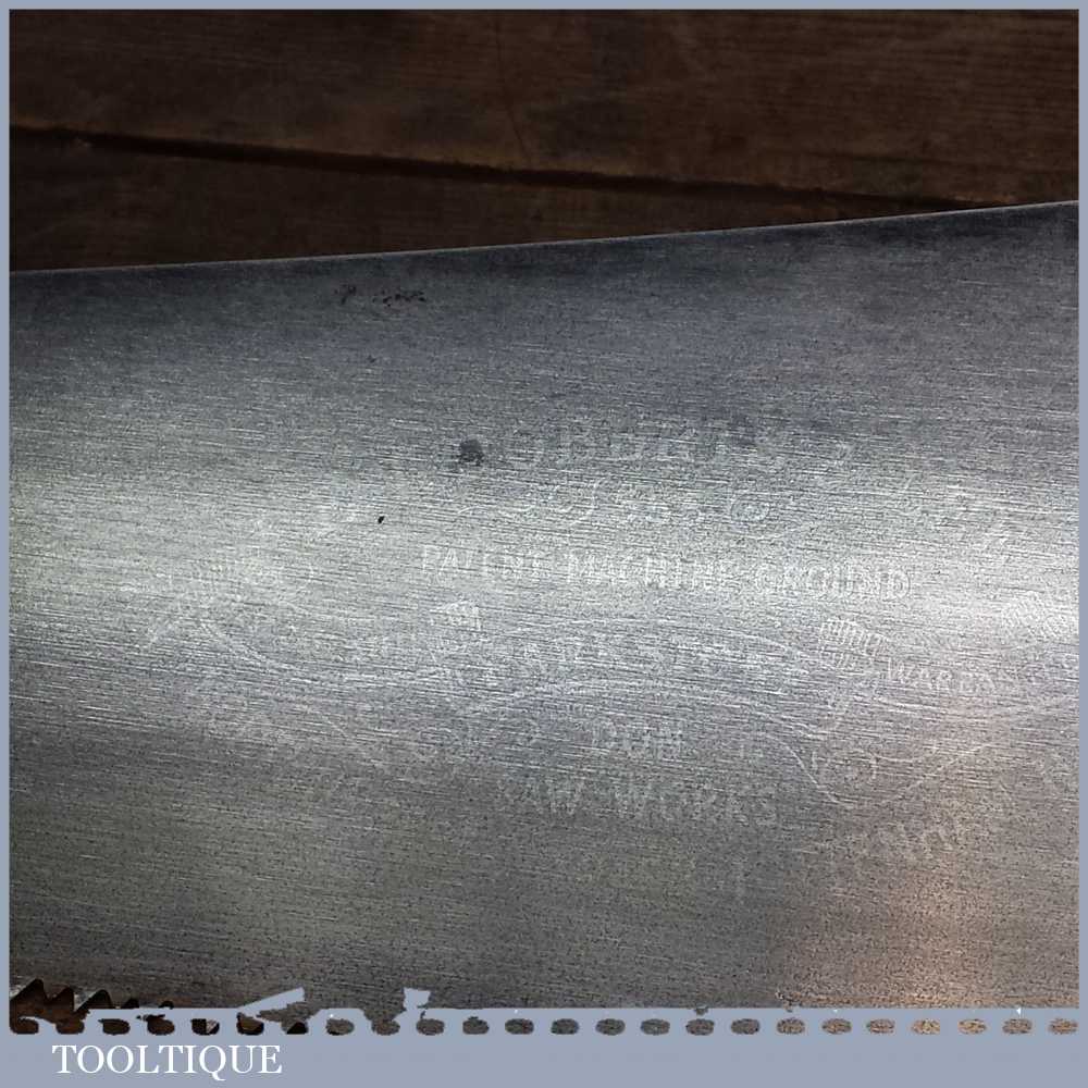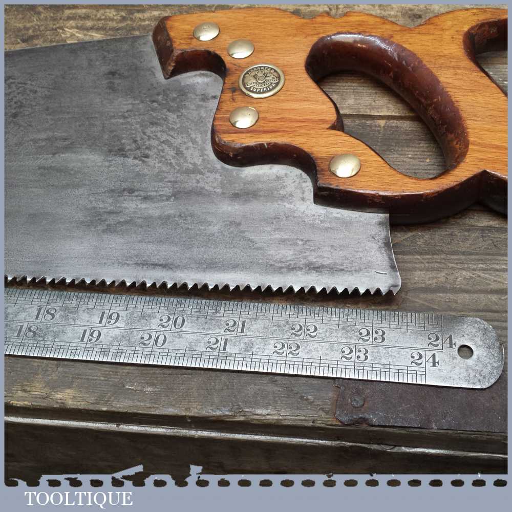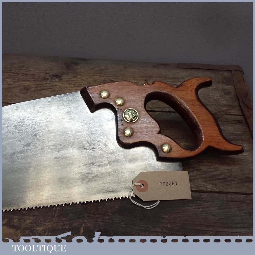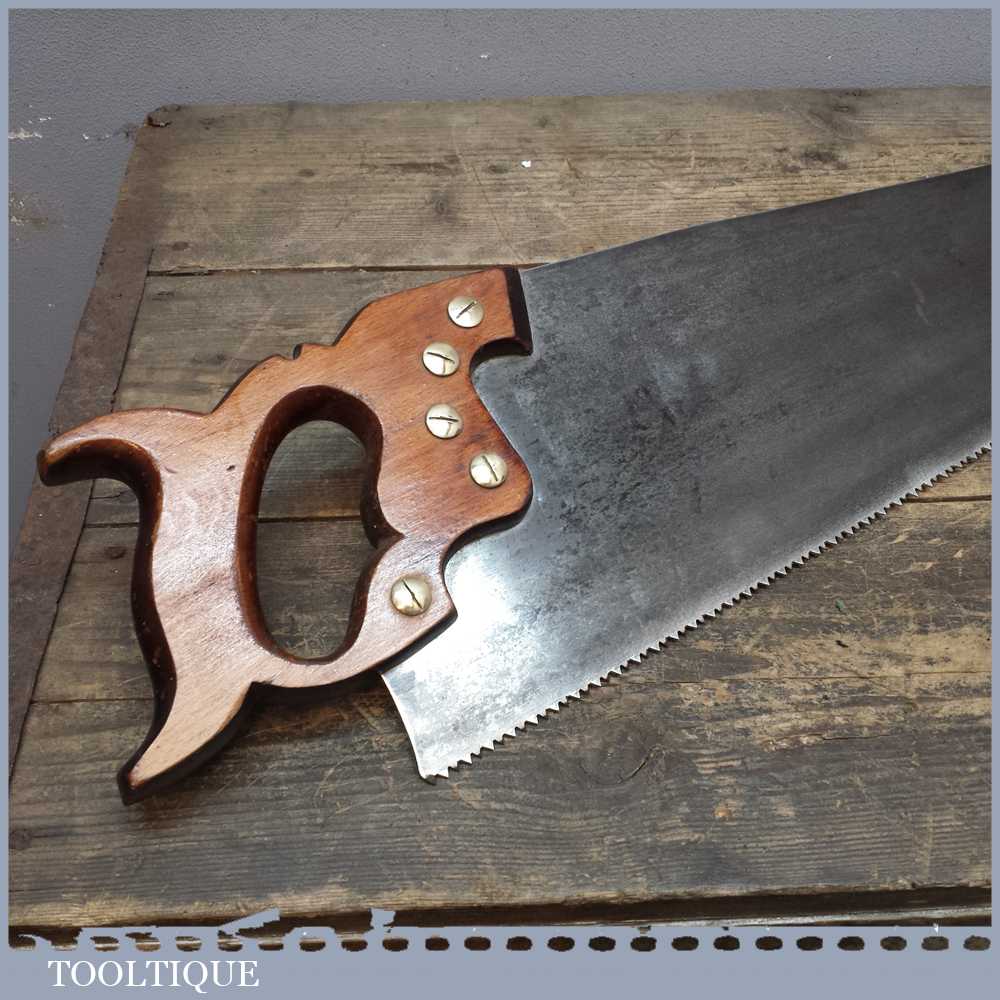 Vintage E T Roberts & Lee 23 ½” cross cut handsaw in good used condition. It has 7 tpi, it is straight with a crown curve to the tooth line to minimise contact for supposedly easier cutting and has been sharpened and set ready for use.