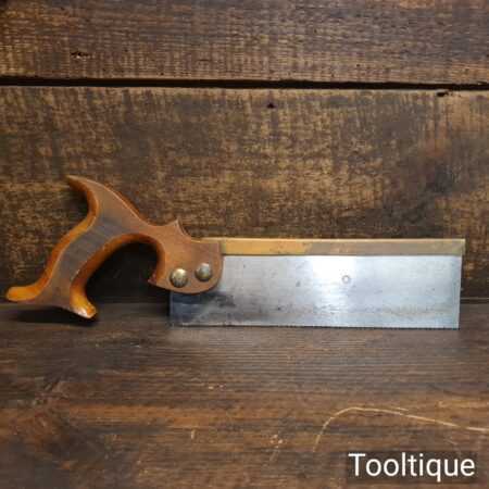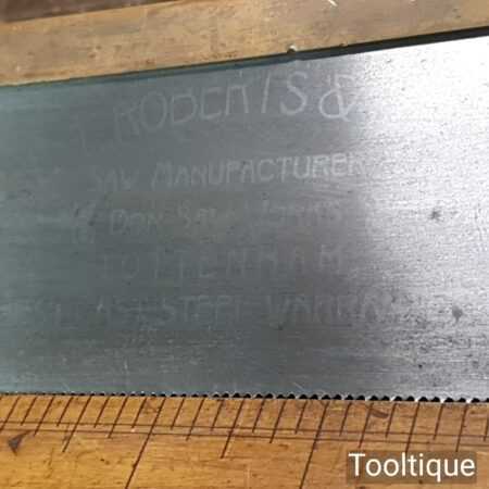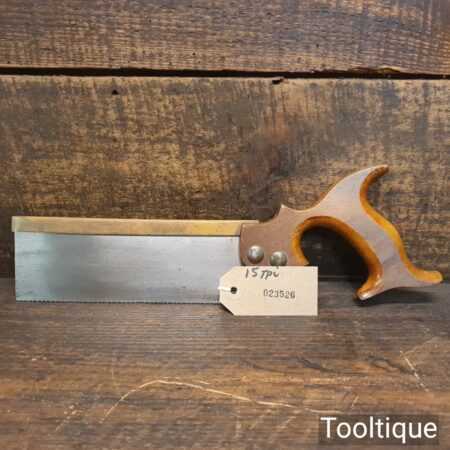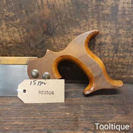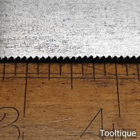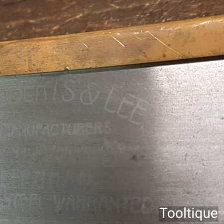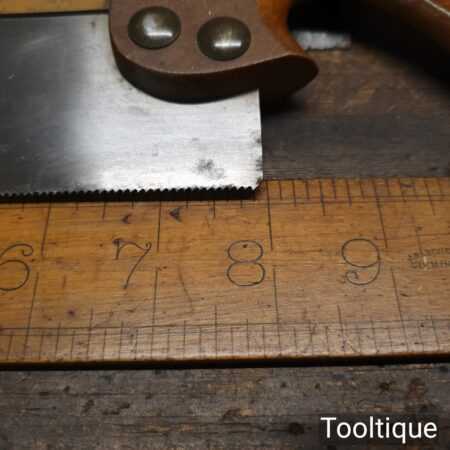 The saw has been thoroughly cleaned including under the handle, jointed, resharpened and set by hand so that all the hard work of getting an old vintage saw right has been undertaken. We do this so that the next sharpening is easier and no more than a quick freshen up would be required. Those who are familiar with sharpening will know this is no small job and requires skill, effort and time to achieve good results.