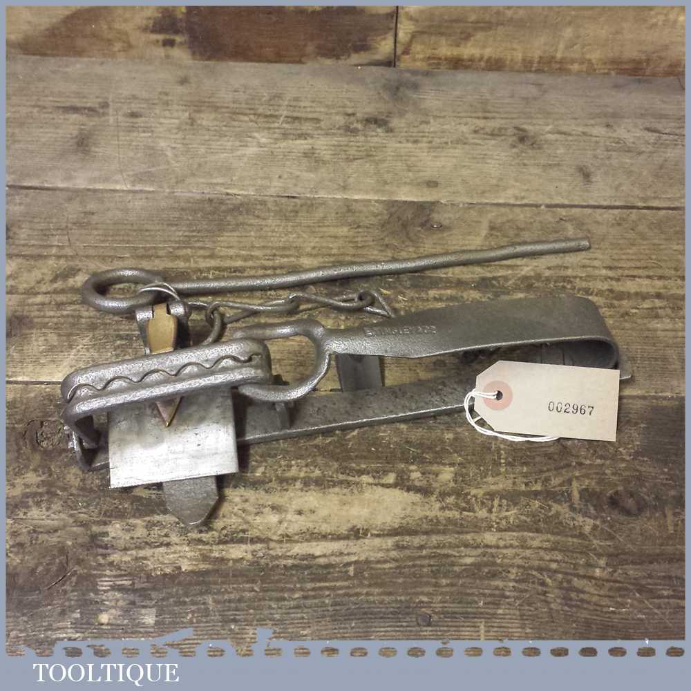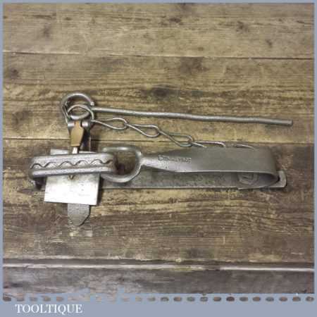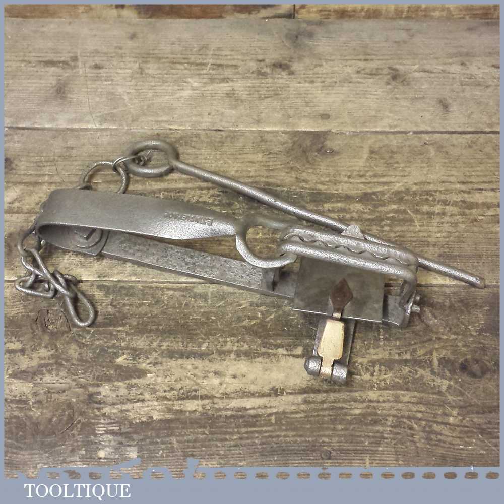 Vintage E Tinsley gin trap with brass tongue and catch. The trap measures approx 11” long.