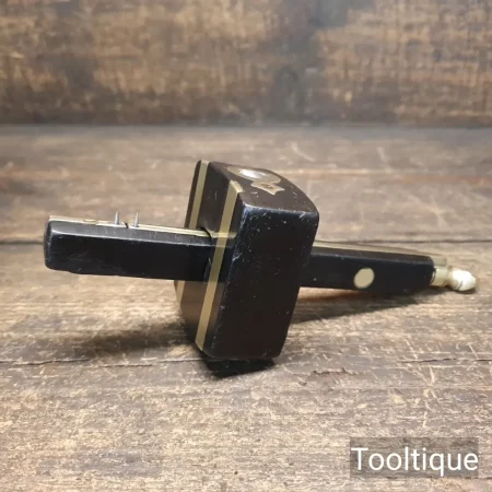 Vintage Ebony & Brass Carpenters Mortice Gauge with Thumb Screw Adjustment and good length tool steel pins, fully refurbished ready for use and in good used condition. Note: Adjusts Freely and has internal screw clamping plate.