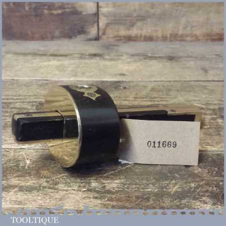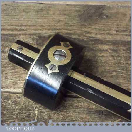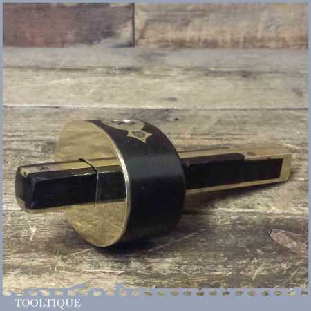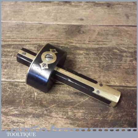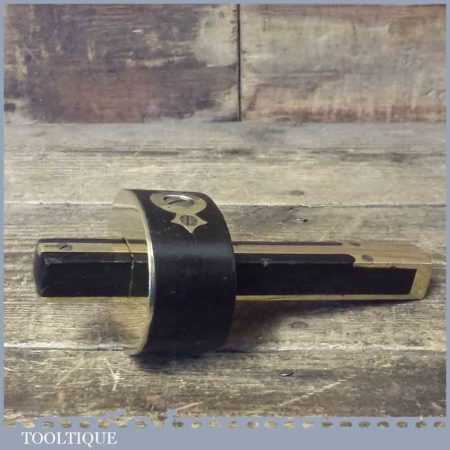 Vintage ebony and brass stemmed mortise gauge with screw adjuster, good pins and its internal brass groove guide in good used condition.