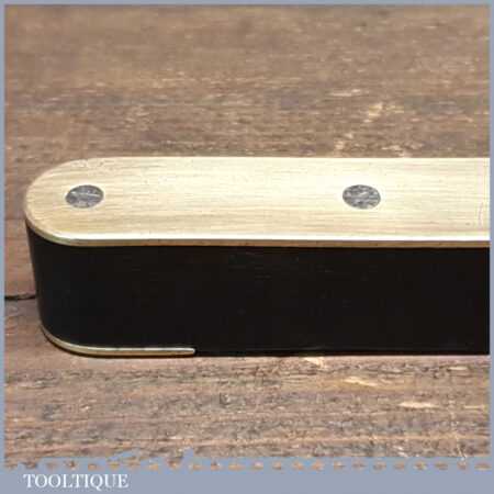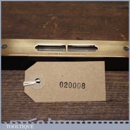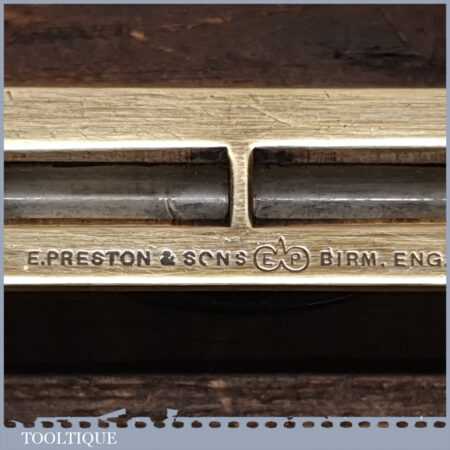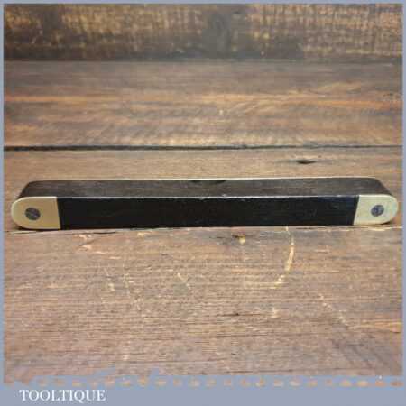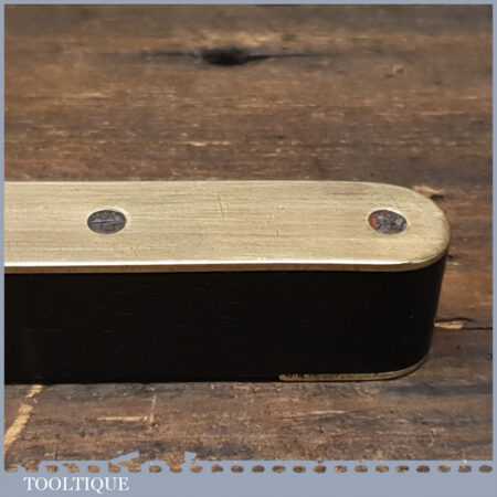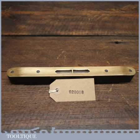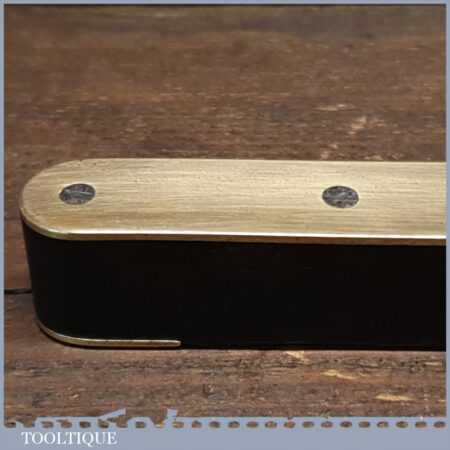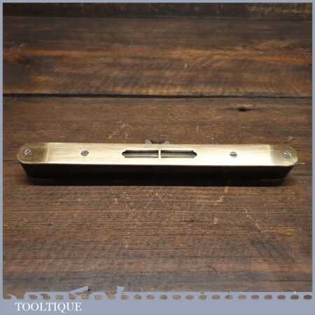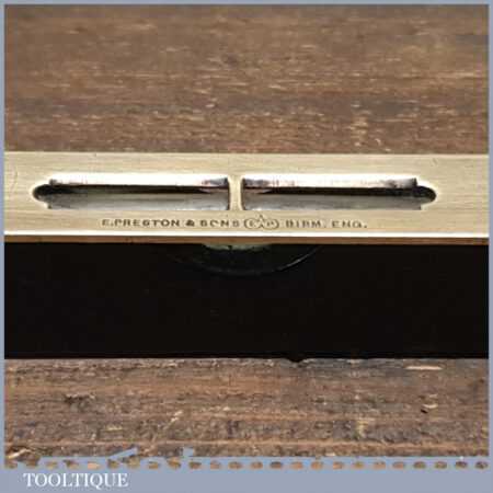 Vintage Edward Preston & Sons 8” ebony and brass spirit level with original clear bubble tube, in good used condition. Note: the level hasn’t been tested and may require resetting in putty if intended for use.