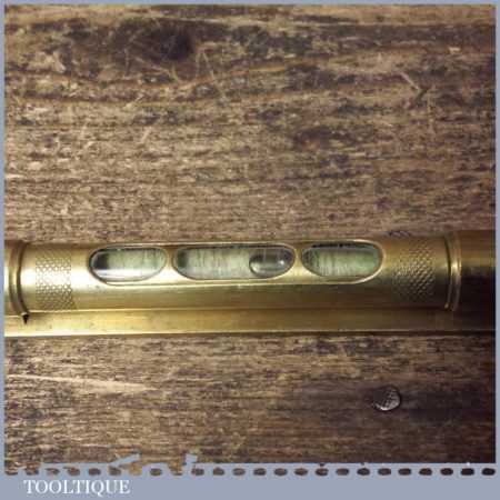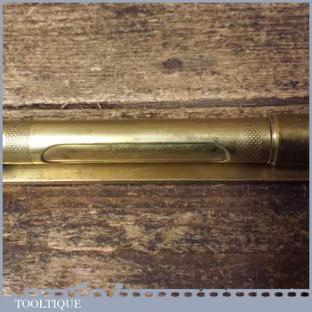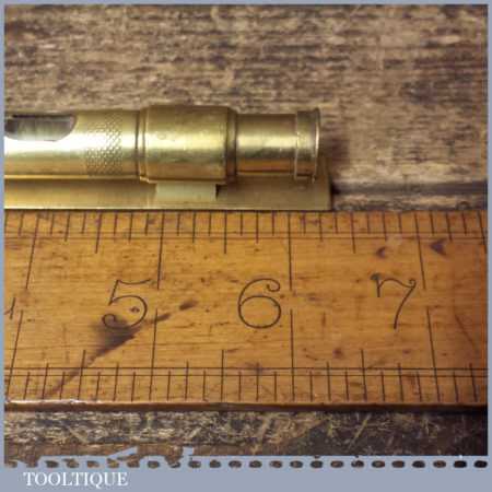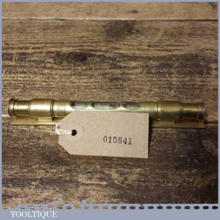 Vintage engineer’s 6” brass spirit level with original clear bubble tube with revolving protective cover, in good used condition. Note: the level hasn’t been tested and may require resetting in putty if intended for use.