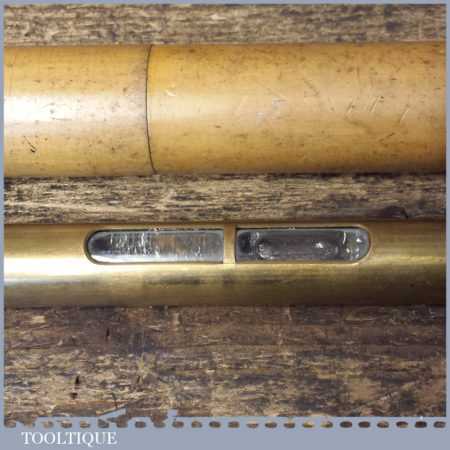 Vintage engineer’s brass spirit level with original clear bubble and in boxwood container, in good used condition. Note: the level hasn’t been tested and may require resetting if intended for use.