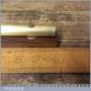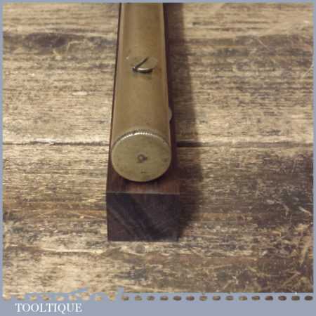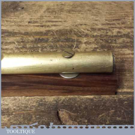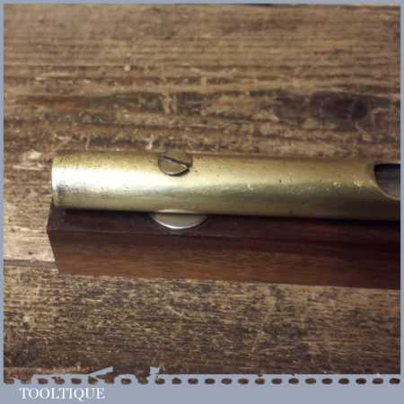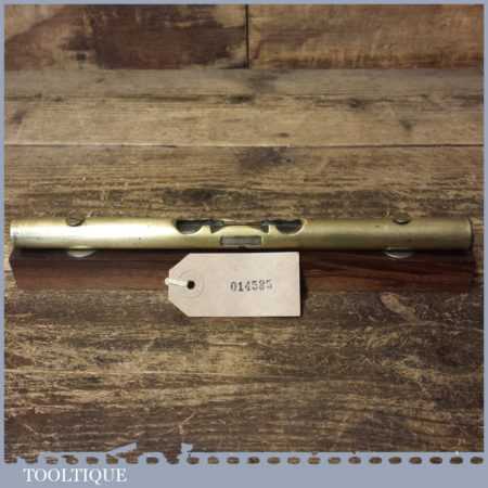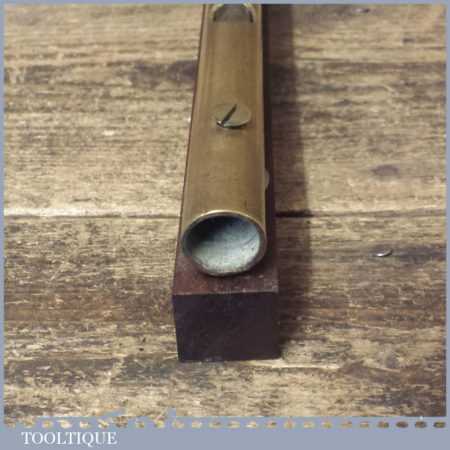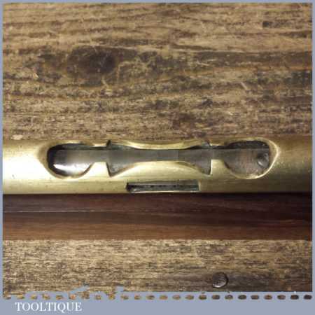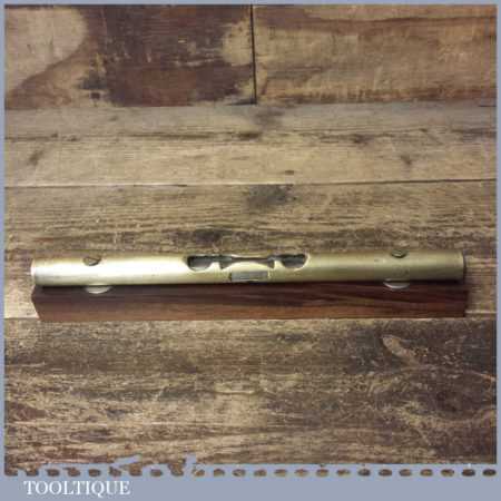 Vintage engineer’s brass spirit level on 10” on a mahogany base, with original clear bubble and in good used condition. Note: the level hasn’t been tested and may require resetting if intended for use. Note: Brass stopper missing at one end.