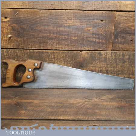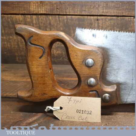 Vintage English 18” cross cut panel handsaw with 7 tpi, fully refurbished and sharpened ready for use. Nice little trade saw that has good steel and sharpened well