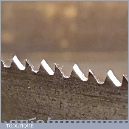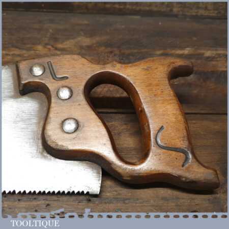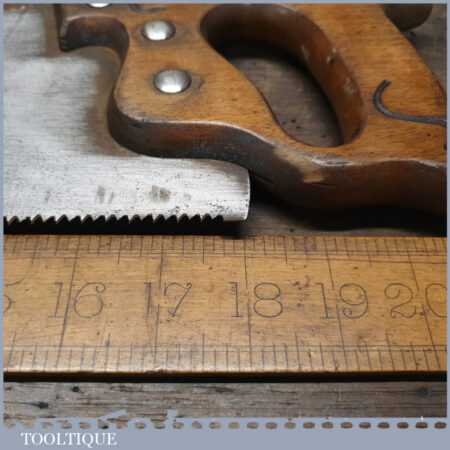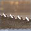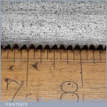 The saw has been thoroughly cleaned, jointed, resharpened and set by hand so that all the hard work of getting an old vintage saw right has been undertaken. We do this so that the next sharpening is easier and no more than a quick freshen up would be required. Those who are familiar with sharpening will know this is no small job and requires skill, effort and time to achieve good results.