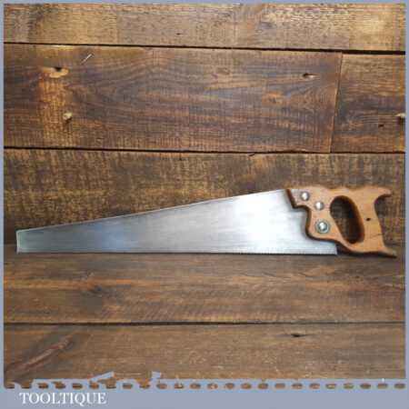 Vintage English 20” cross cut panel handsaw with 10 tpi, fully refurbished and sharpened ready for use. Trade saw probably made in Sheffield but has good steel and sharpened and set nicely.