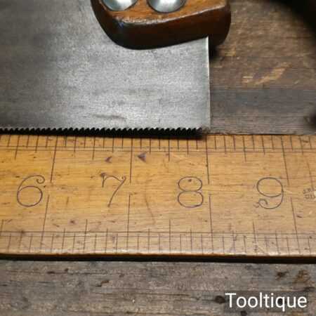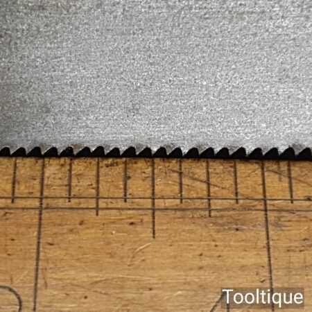 The saw has been thoroughly cleaned, jointed, resharpened and set by hand so that all the hard work of getting an old vintage saw right has been undertaken. We do this so that the next sharpening is easier and no more than a quick freshen up would be required. Those who are familiar with sharpening will know this is no small job and requires skill, effort and time to achieve good results.