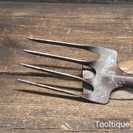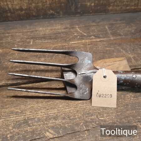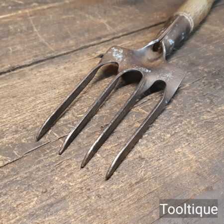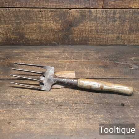 Vintage English gardeners hand fork with a hardwood handle, in good used condition. Note: The handle fits tightly to the head.