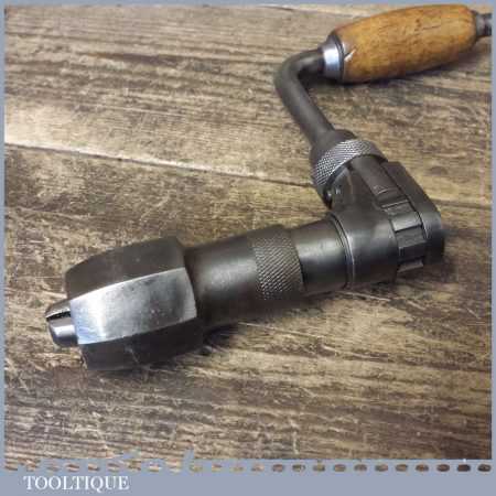 Vintage English made carpenter’s ratchet brace with beechwood handles and a 10” swing, refurbished ready for use.