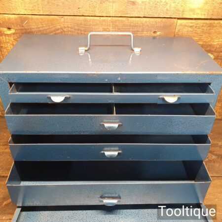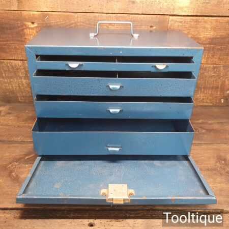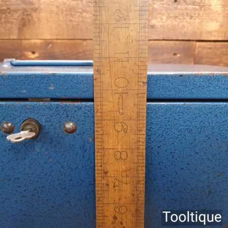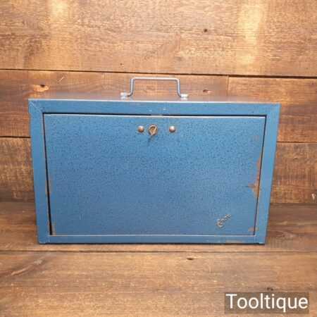 Vintage Enox pressed steel engineer’s tool box with a key in good used condition.