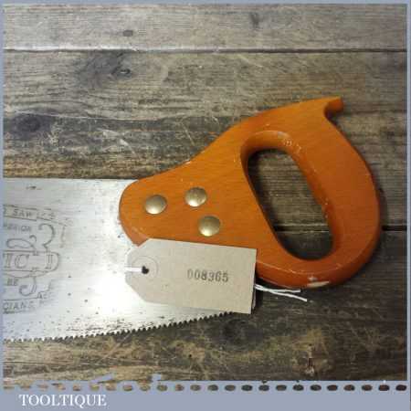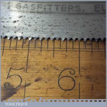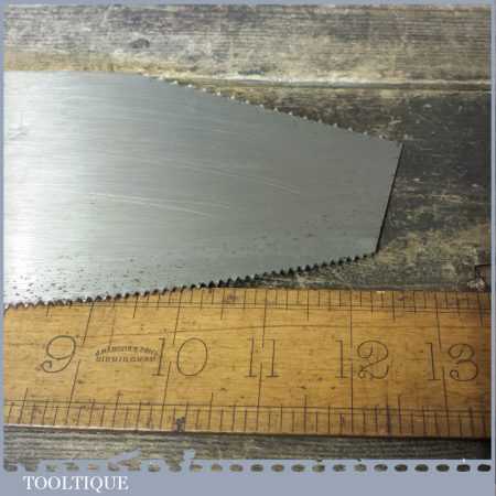 The saw has been lightly cleaned, jointed, resharpened and set by hand so that all the hard work of getting an old vintage saw right has been undertaken. We do this so that the next sharpening is easier and no more than a quick freshen up would be required. Those who are familiar with sharpening will know this is no small job and requires skill, effort and time to achieve good results.