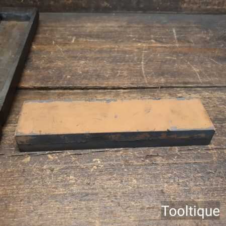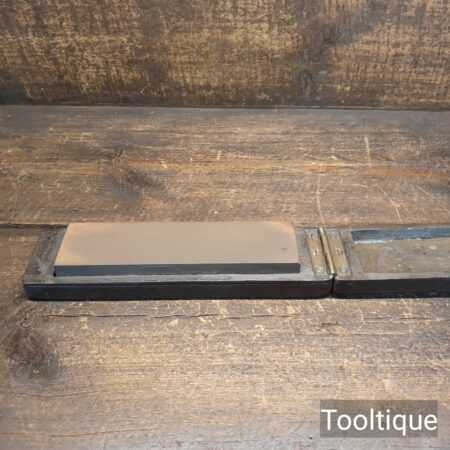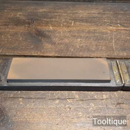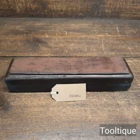 Vintage Fine grade India sharpening stone in a wooden box fitted with leather strop refurbished ready for use and in good used condition. Note: Works a treat with our Acutus honing fluid.
