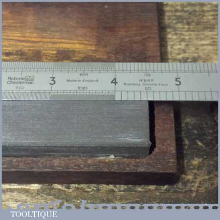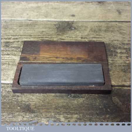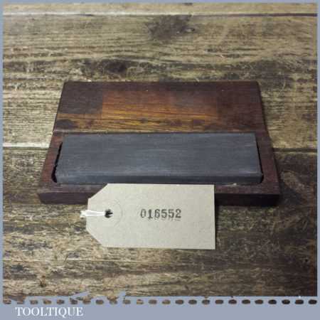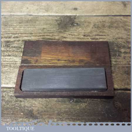 Vintage fine grit natural welsh slate honing stone in a pine box measuring 4 ½” x 1 ¼” in good used condition. Note: lapped flat ready for use can be used with water or fine grade oil.
