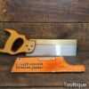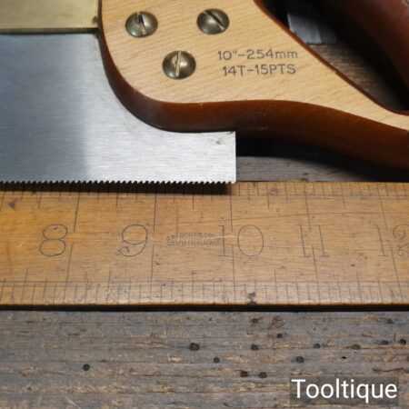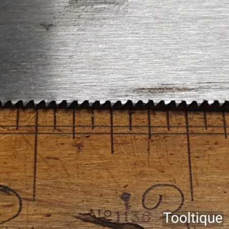 The saw has been thoroughly cleaned, jointed, resharpened, and set by hand so that all the hard work of getting an old vintage saw right has been undertaken. We do this so that the next sharpening is easier and no more than a quick freshen up would be required. Those who are familiar with sharpening will know this is no small job and requires skill, effort, and time to achieve good results.