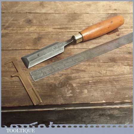 Vintage forged steel chisel by F Woodcock of Sheffield is in good condition and has been sharpened & honed ready for use, this bevel edge chisel measures approx 1 7/16” wide.