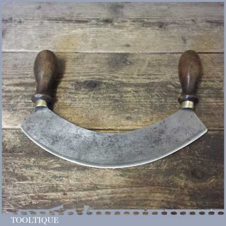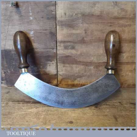 Vintage French kitchenalia chef’s mezzaluna cutter for mincing, chopping, dicing in good used condition. Note: The handle has been lacquered & sealed and it is very sharp if intended for use. Note: Stamped with partial makers mark and guarantee for quality cast steel.