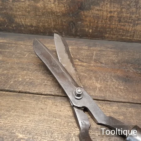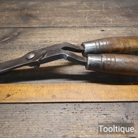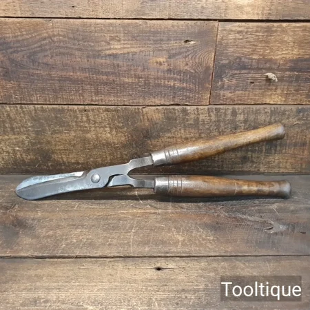 Vintage Gardeners Heavy Cast Steel Dumpy Hedge Trimming Shears with Beechwood Handles, fully refurbished ready for use and in good used condition. Note: Faces Redressed to eliminate wear, Primary & secondary Bevels sharpened to ensure these cut rather than hack (Cuts paper like scissors), the handles are tight fitting. (Care Tip: Clean with WD-40 and Oil after Use).