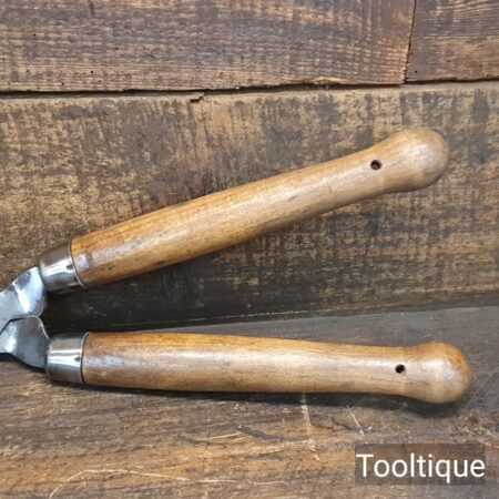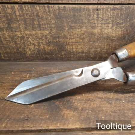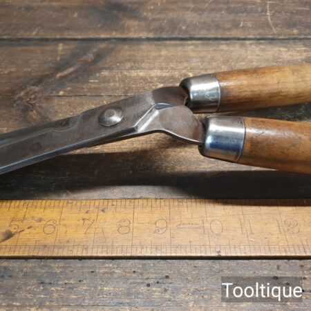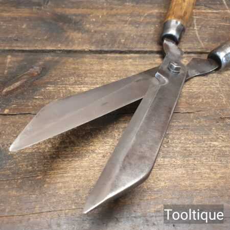 Vintage gardening shears with beechwood handles measuring 19” in total length in good used condition, fully refurbished sharpened and honed ready for use. Note: these have been properly sharpened where they will slice rather than hack and will cut paper like scissors. The faces have also been dressed to eliminate wear.