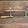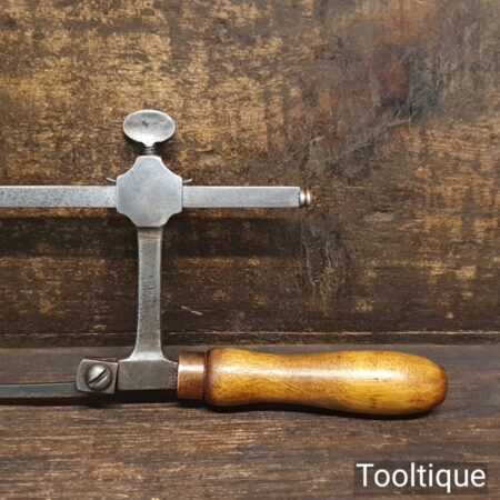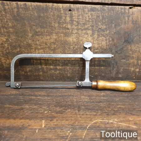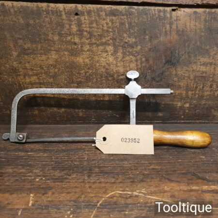 Vintage German adjustable jewellers piercing saw in good used condition. These saws are of high quality and superior cast steel construction with wooden handle. It’s marked Foreign which helps to identify its origin as many German tools were stamped this way. Note: This has a file saw type blade but can hold other types.