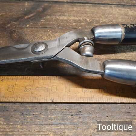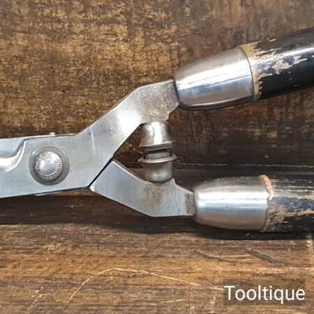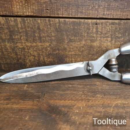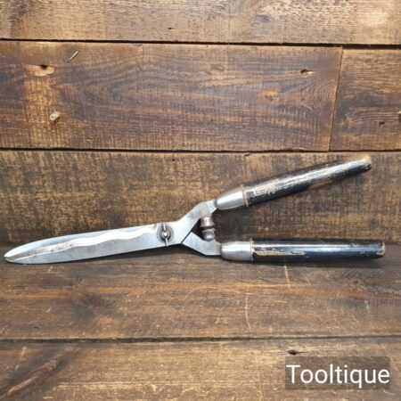 Vintage German made cast steel top flat hedge trimmers garden shears with beechwood handles measuring 22” in total length in good used condition, fully refurbished sharpened and honed ready for use. Note: these have been properly sharpened where they will slice rather than hack and will cut paper like scissors. The faces have also been dressed to eliminate wear.