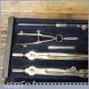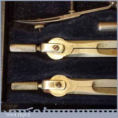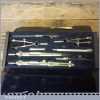 Vintage German silver technical drawing set in a case in good used condition. Note: These haven’t been cleaned and ‘German silver’ is a term used to describe white metal alloy used instead of brass.