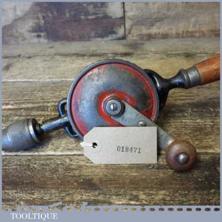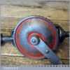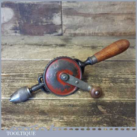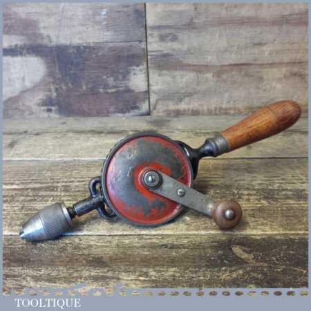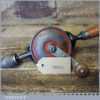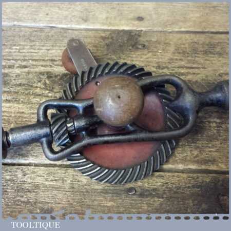 Vintage German single pinion egg beater hand drill (with screw-top beechwood handle to take bits) in good used condition and ready for use. Typically marked foreign.