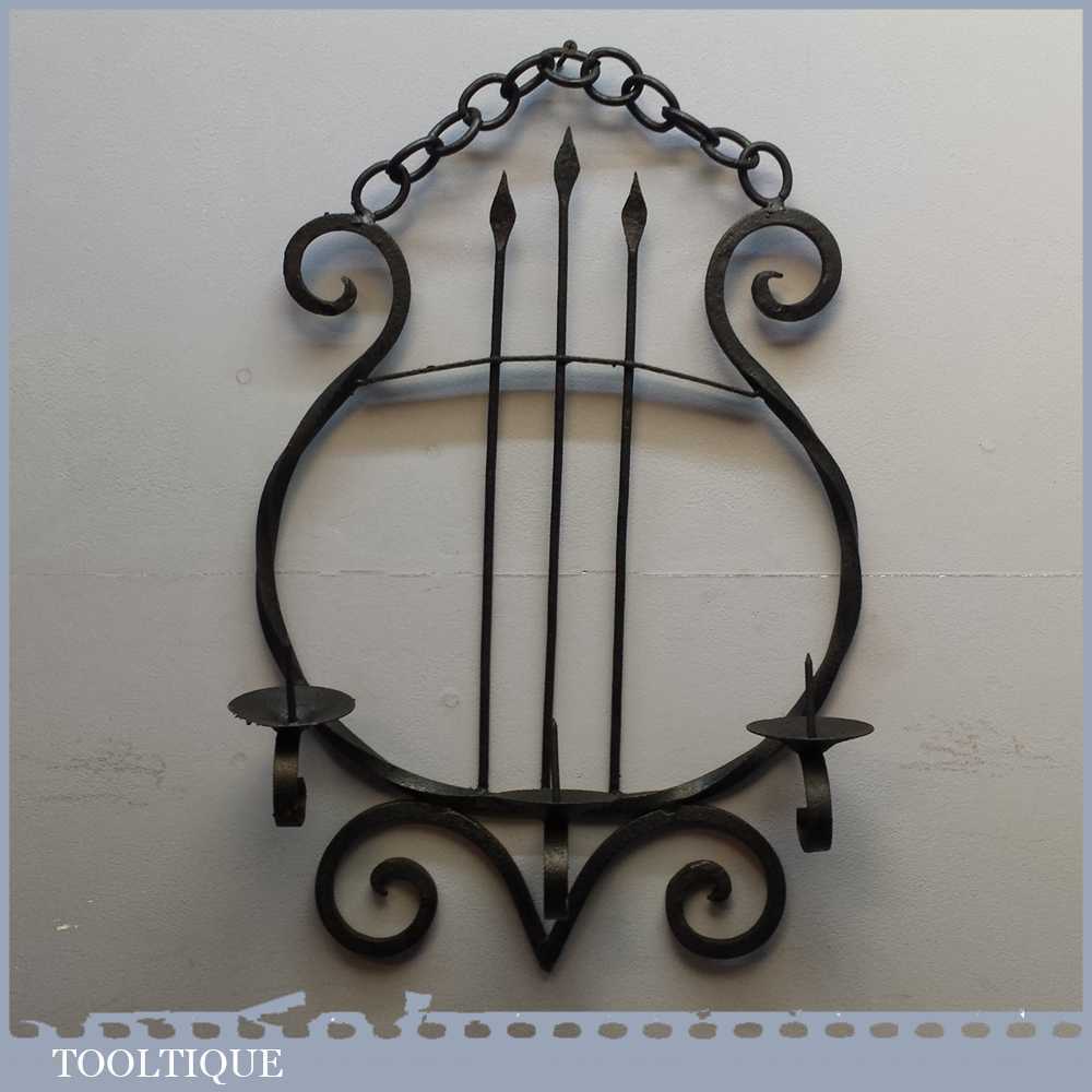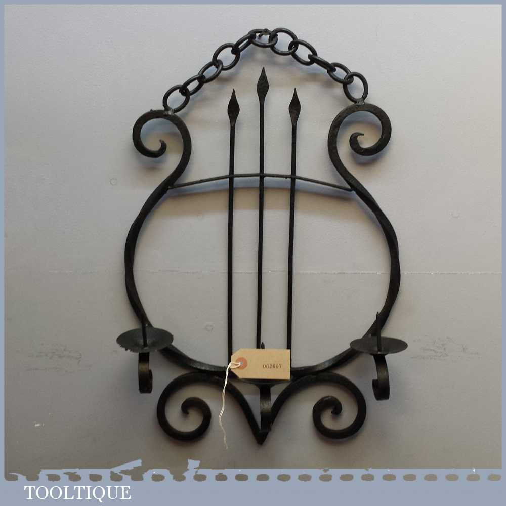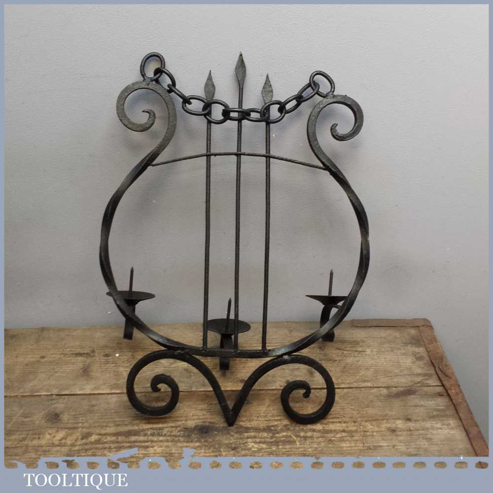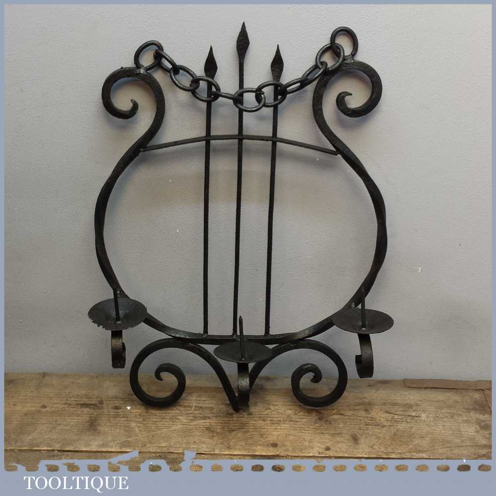 Vintage Gothic medieval Style wrought iron work candle holder or sconce which hooks up by its chain on to a wall. It does have some corrosion to one of the candle holders (see images) but wouldn’t be noticed with the addition of some white wax church type candles. Measures approx 19” tall so is a good sized item which holds 3 no: candles