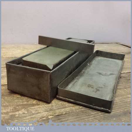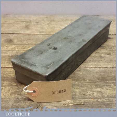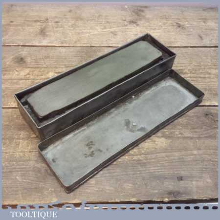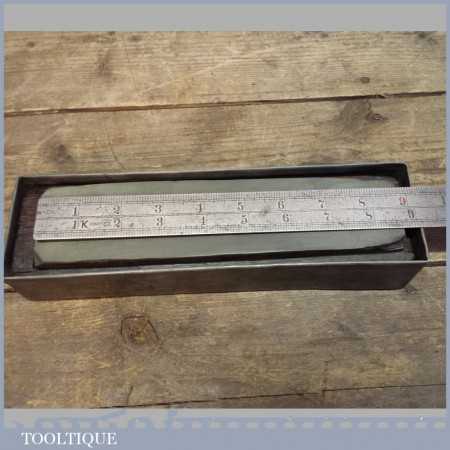 Vintage Green Charnley Forest honing oil stone in a wooden base housed in a metal box with lid, this natural stone measures 9” long and 2” wide and has been dressed flat to ensure you get an even hone on either razors or edge tools.