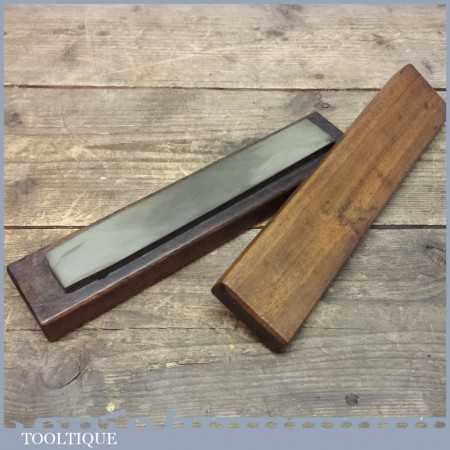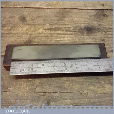 Vintage Green Charnley Forest honing oil stone in a wooden box, this natural stone measures 8” long and 1 1/4” wide and has been dressed flat to ensure you get an even hone on either razors or edge tools.