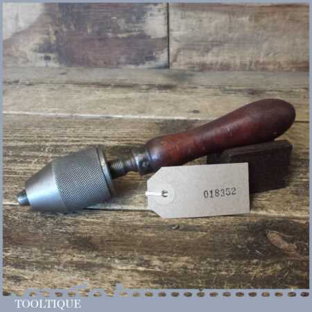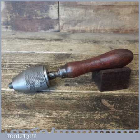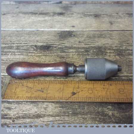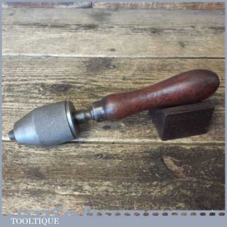 Vintage hand-held keyless drill chuck with beechwood handle in good used condition.