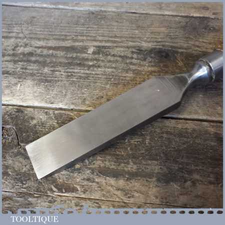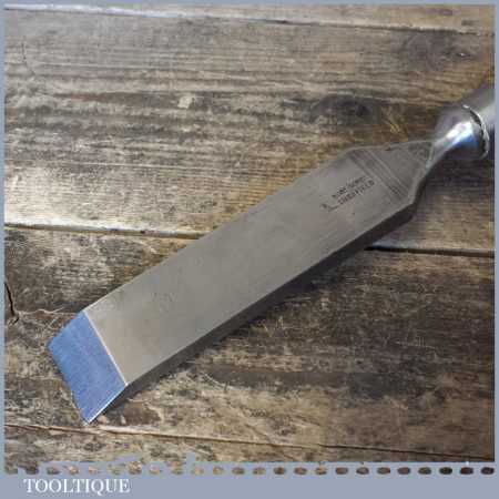 The chisel has been checked to ensure the tang is seated properly and the handle is solid and fit for use. All refurbished chisels are water cooled during the sharpening process to ensure the tempering is not affected. These old cast steel chisels are hand forged and far superior in quality because of the high carbon steel that was used which produces a keener edge, this was also generally used throughout the full length.